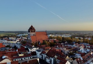 Ik sta op de Storchenwiese in Greifswald, een klein stukje ten westen van het oude stadscentrum. Zacht golvend gras in het ochtendlicht, grazende paarden, de skyline van de stad op de achtergrond met de torenspitsen van de drie kerken die oprijzen in de wolkenloze hemel - de bijna 100 meter hoge toren van de St. Nikolai kathedraal met zijn barokke spits, de kraaknette, massieve toren van de Mariakerk en het steile tentdak van de St. Het is een aanblik uit lang vervlogen tijden. Alleen het geroffel van de grasmaaier die de Nieuwe Begraafplaats achter me netjes houdt, geeft aan dat er meer dan twee eeuwen zijn verstreken sinds Caspar David Friedrich juist dit motief schilderde: „Weiden bij Greifswald“.