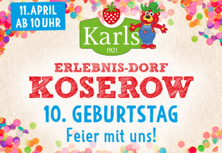 Świętuj 10 lat Karls Erlebnis-Dorf Koserow 11 kwietnia 2026 roku z kolorowym programem rodzinnym, wspaniałymi ofertami i mnóstwem niespodzianek. Czekamy na zabawę, zajęcia i truskawkowe atrakcje dla młodszych i starszych!